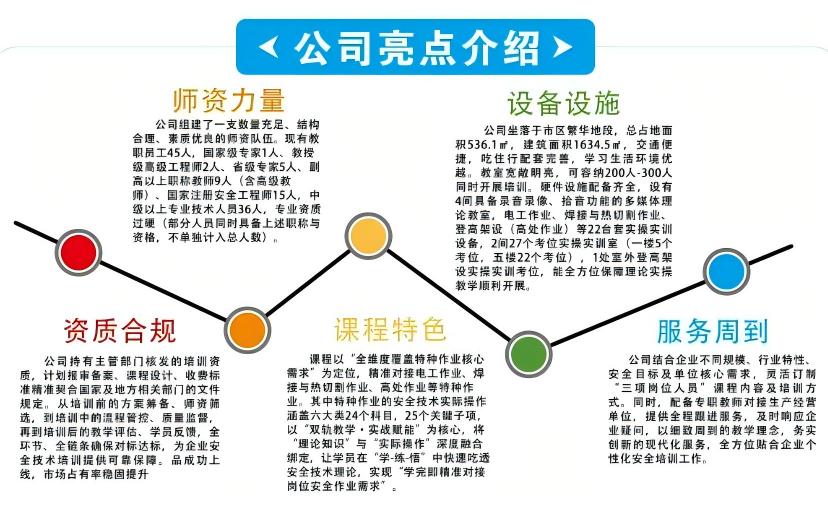 公司主要承担全市金属非金属矿山、工商经贸、烟花爆竹、危险化学品、小水电在内的生产经营单位主要负责人、安全管理人员的安全生产知识和管理能力培训以及电工作业、焊接与热切割作业、登高架设(高处作业)等特种作业人员安全技术理论、安全技术实际操作培训服务。通过安全技术培训,从源头上消除"最大的安全隐患",致力于提升本质安全水平,减少生产安全事故发生,保护人民生命财产安全,成为安全教育培训行业标杆。