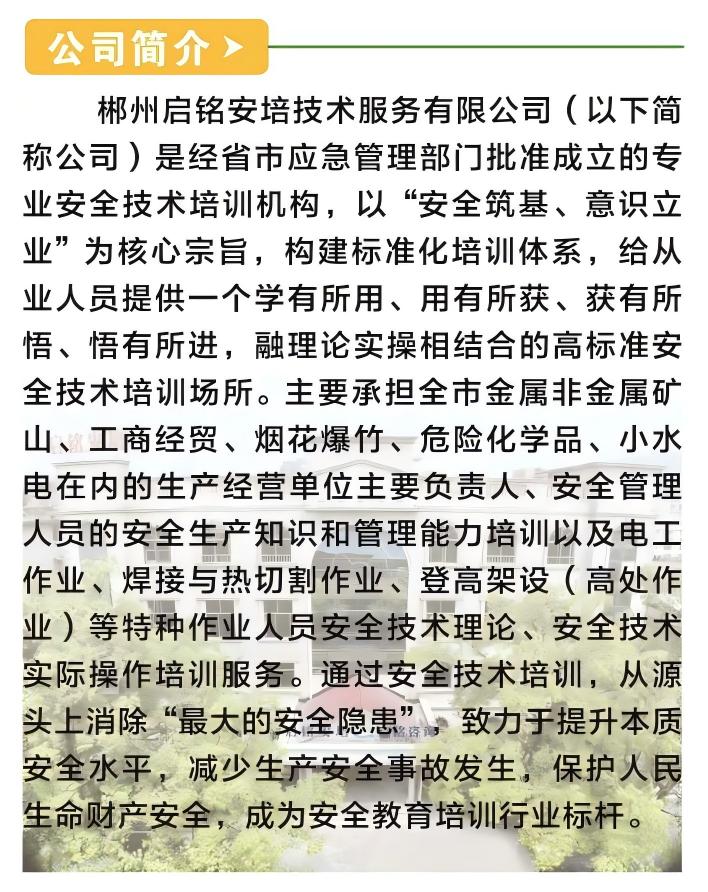 郴州启铭安培技术服务公司(以下简称公司)是经省市应急管理部门批准成立的专业安全技术培训机构,以"安全筑基、意识立业"为核心宗旨,构建标准化培训体系,给从业人员提供一个学有所用、用有所获、获有所悟、悟有所进,融理论实操相结合的高标准安全技术培训场所。